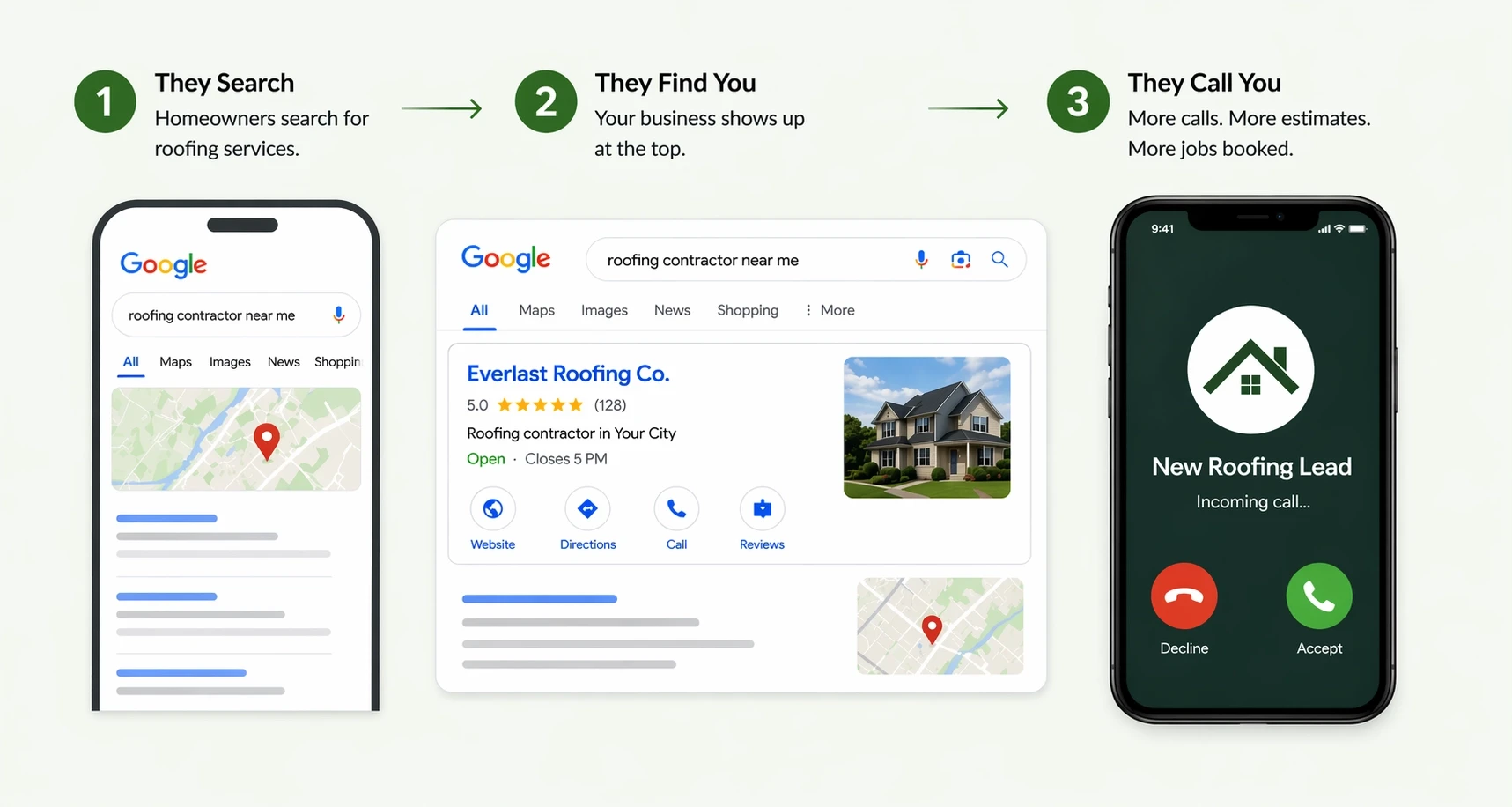 Google's own data shows that nearly every homeowner looking for a roofer starts with a search. They type "roofer near me" or "roof replacement [city]" and they call whoever shows up first. If your business is sitting on page 3 (or worse, page 7) you are not even in the conversation.