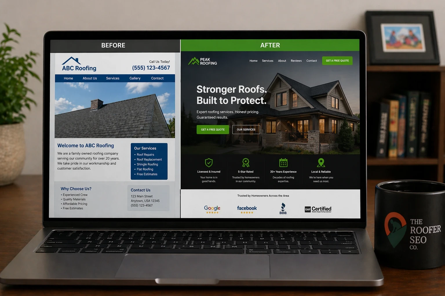 SEO baked into the foundation Real keyword targeting, proper HTML structure, and schema markup from day one. | Keyword-stuffed pages that read like a robot wrote them Walls of text crammed with "roofer near me" that Google and homeowners both hate. |