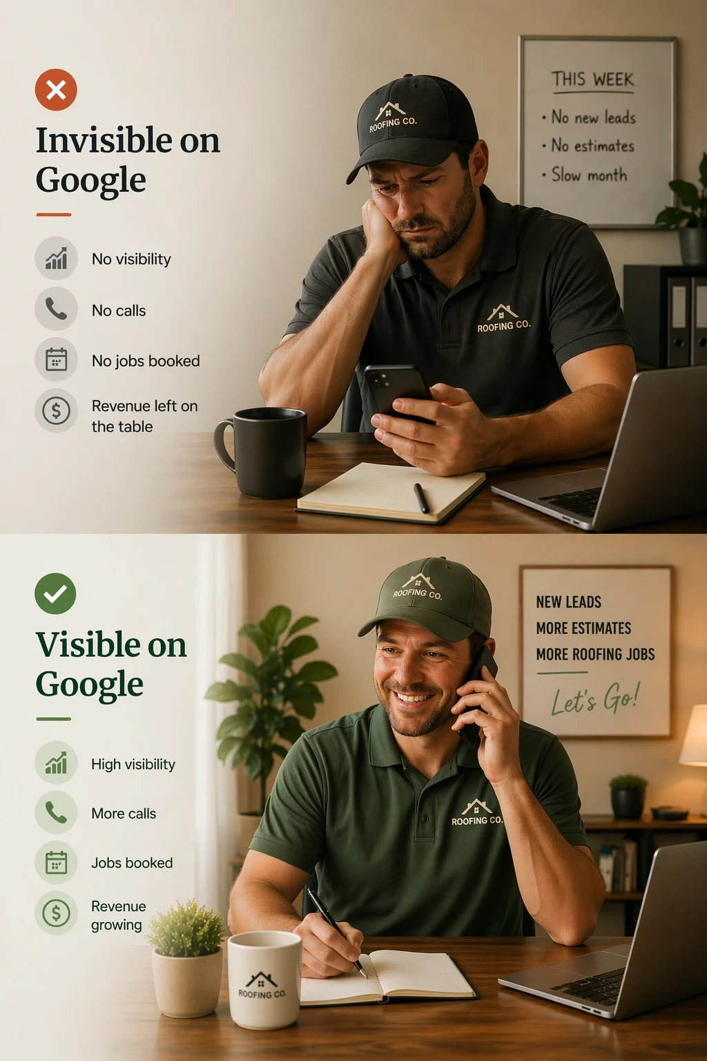 Real photos of your work Your crew, your projects, your neighborhoods. Authentic proof that builds trust. | Stock photos of models in hard hats Generic images of people who've never touched a shingle. Homeowners see through it instantly. |