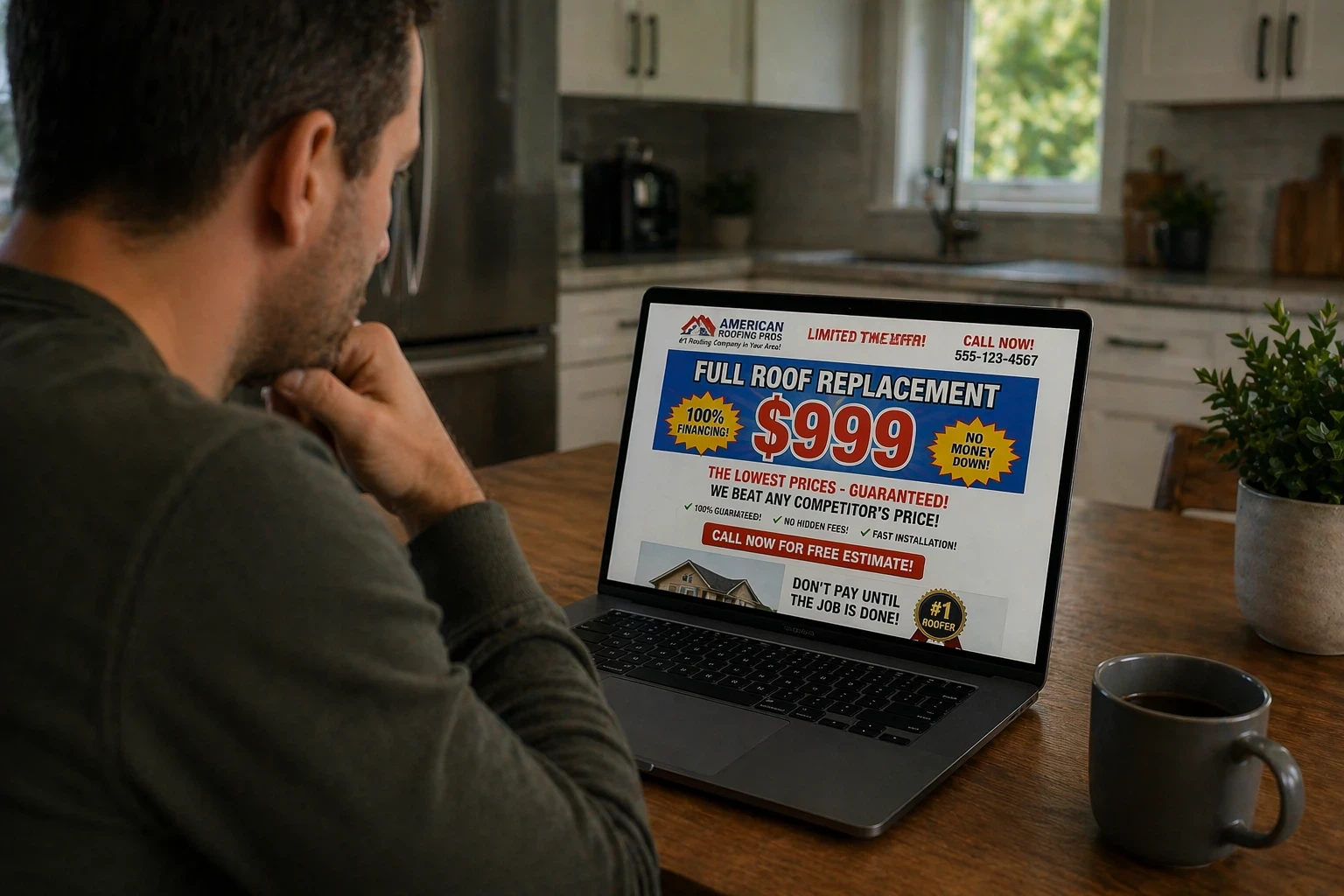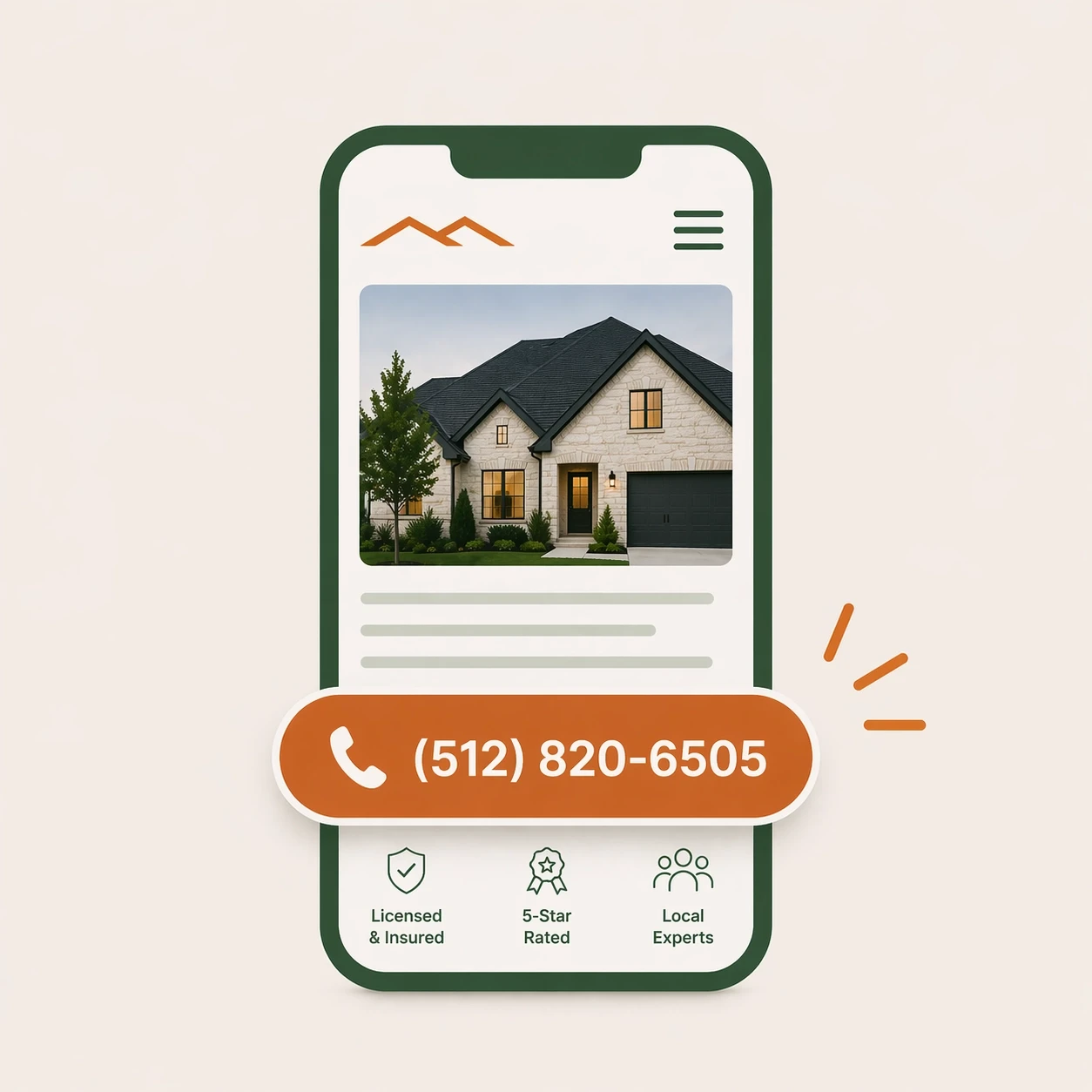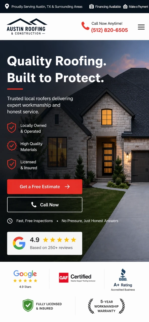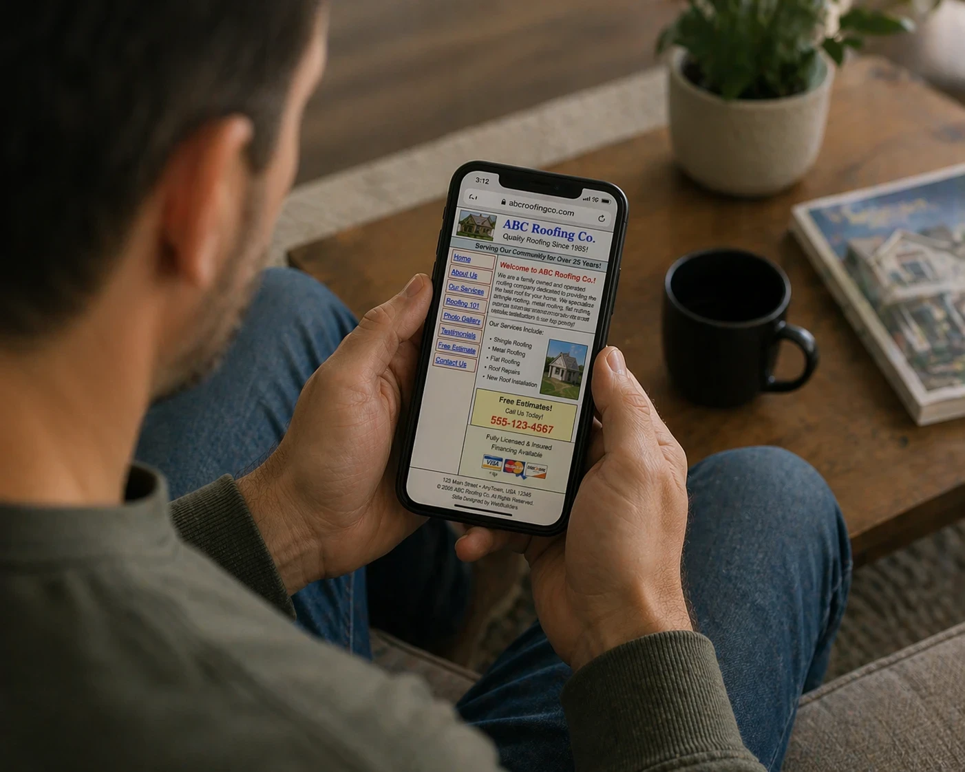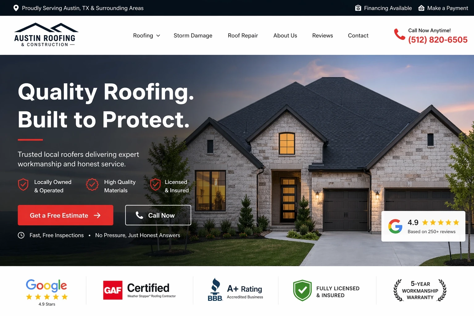 There’s no trust anywhere on the page. No reviews. No photos of real work. No proof that you’ve ever installed a shingle. A homeowner about to spend $8,000 on a roof needs to trust you before they pick up the phone. Your website’s job is to build that trust in under 10 seconds.